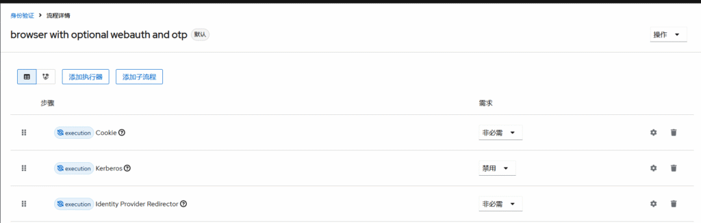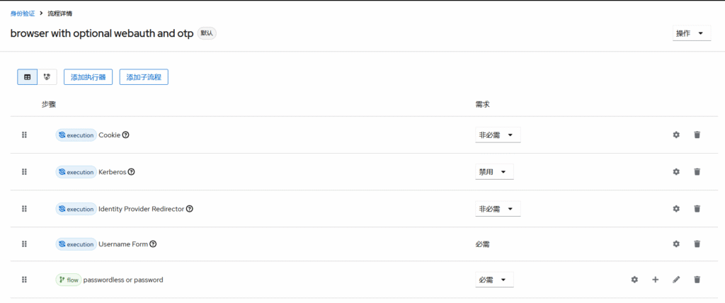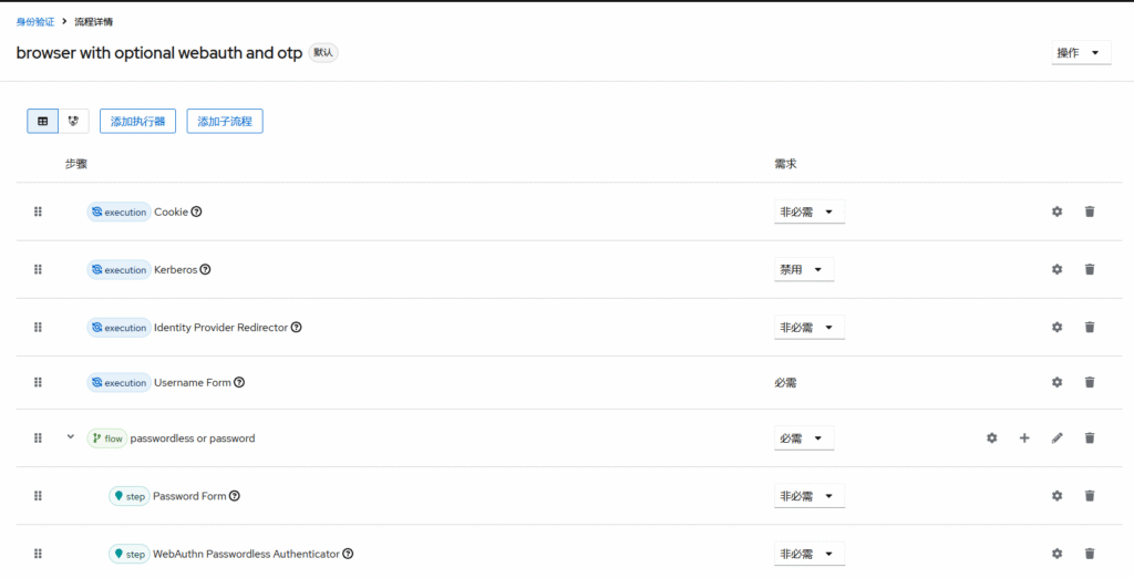 点击子流程的加号 分别添加"Password Form"(密码登录) 和 "WebAuthn Passwordless Authenticator"(通行密钥登录) 这两个子流程 并设置需求为“非必须” (二选一即可登录)